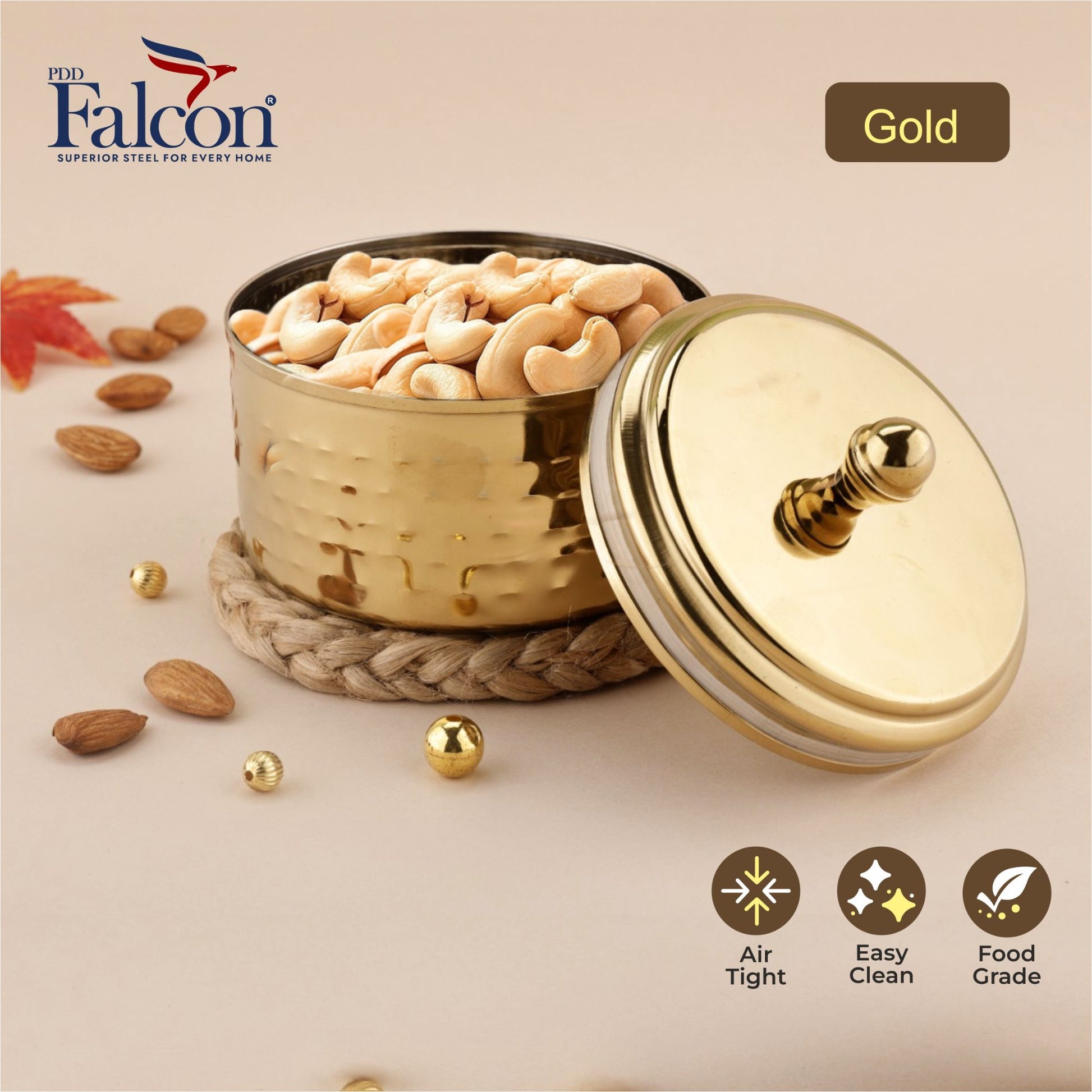 Celebrate the art of gifting with the PddFalcon Stainless Steel Uphaar Hammered Dry Fruit Container Set of 2, designed to bring elegance and utility together. Each container is crafted from premium stainless steel with a luxurious hammered gold finish along with a stylish acrylic tray making it a perfect multipurpose center piece for your dining table, living room, or festive occasions. The set includes two 350 ml airtight containers (total 700 ml capacity) and one Stylish Acrylic Tray which is perfect for Gifting to your loved ones.