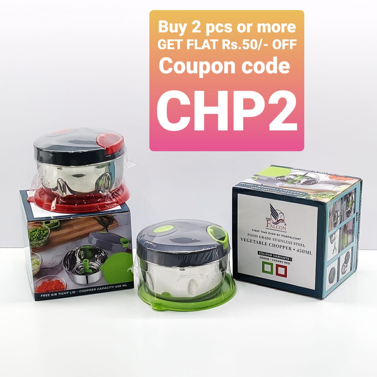 Pdd Falcon bring to you Stainless Steel Handy chopper. If you're looking for a quick and easy solution to chop up your vegetables and fruits, look no further! The Pdd Falcon New Handy Chopper is the perfect and affordable solution for all your chopping needs!. Which is comes with Steel body to retains nutrition of vegetable and doesn't loose its water content. And if you want store your chopped vegetables and fruits for some time, So use extra storage lid which is available in Pdd falcon Steel Chopper Set. The Pdd Falcon Steel Chopper Available in different different color and sizes.