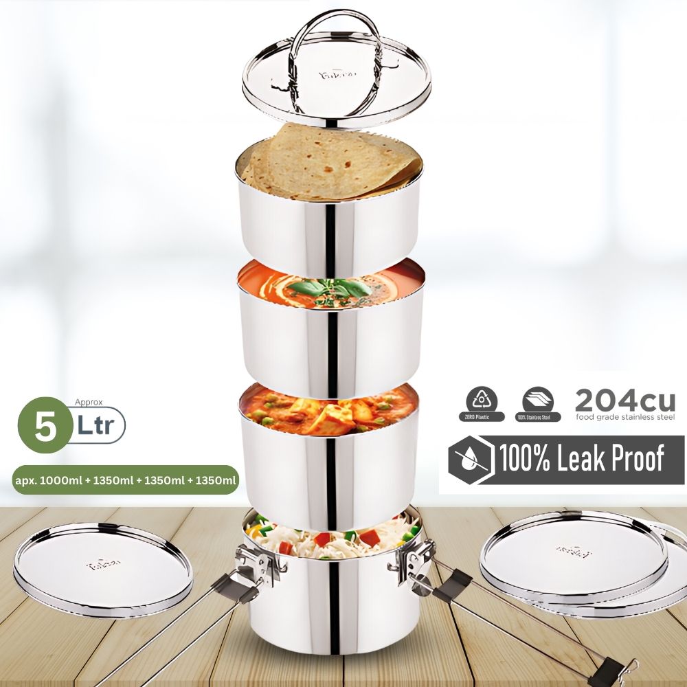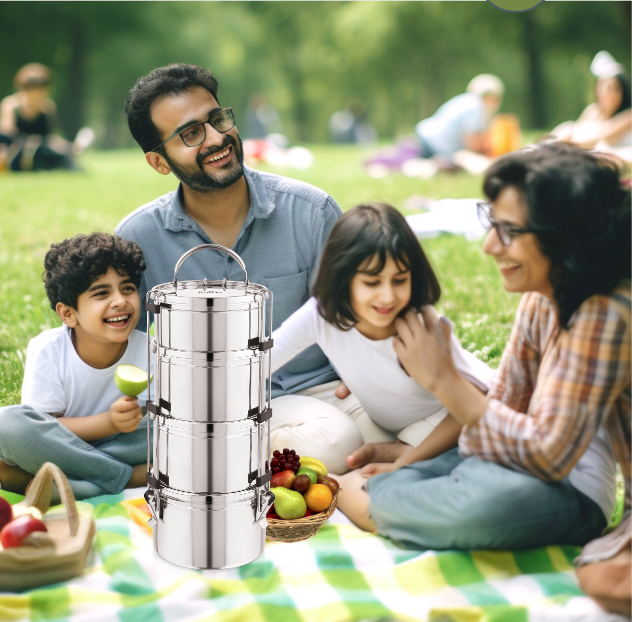 The Royal Commercial Travel Tiffin Box, an extra-large tiffin perfect for sharing meals, picnics, or catering small events. It is made up of the highest quality available in the market, moreover its spacious, leakproof and convenient.